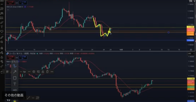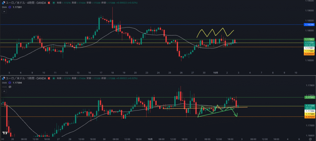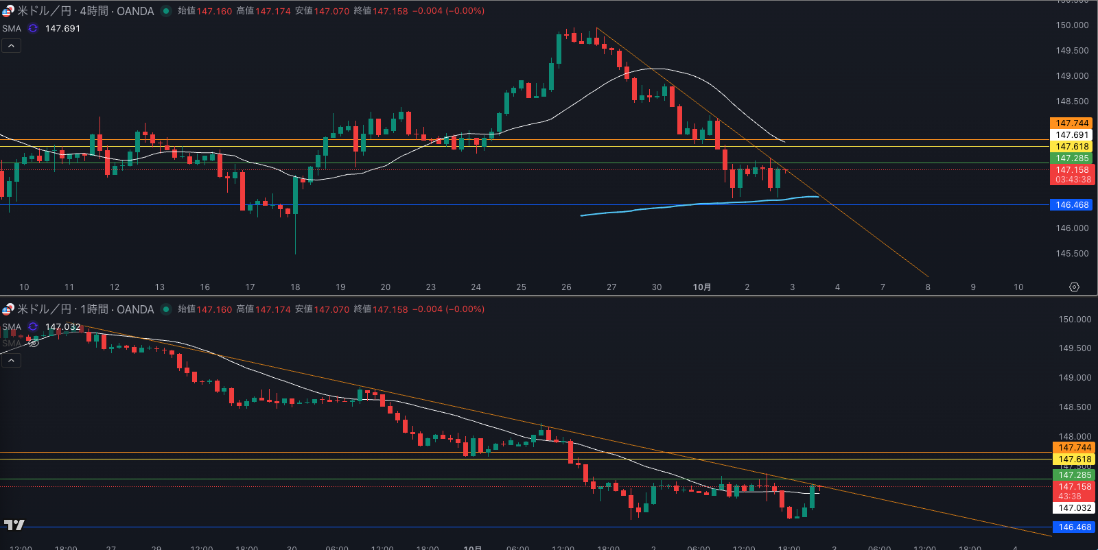 朝の環境認識では1時間斜め攻防ライン抜けをイメージしていたが4時間SMAの上に抜けていったのでこのシナリオはなし