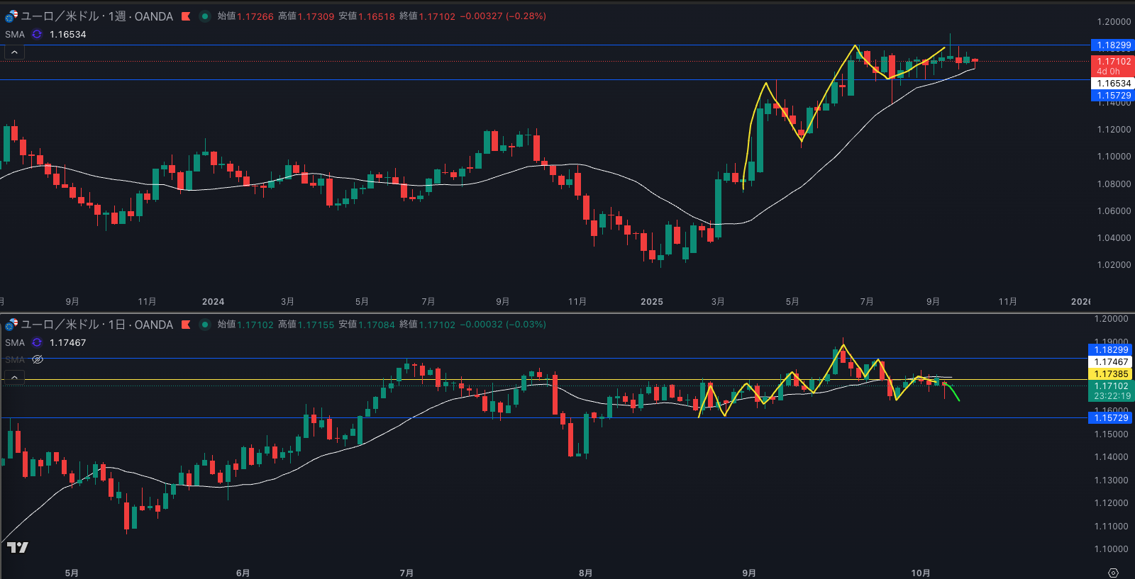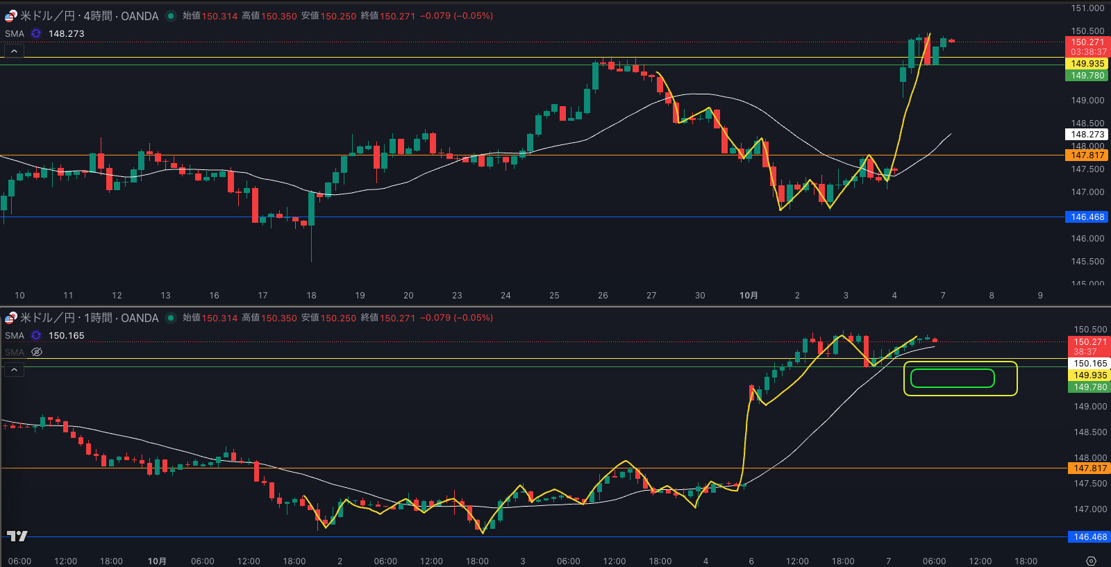 黄色の水平線は日足のサポート