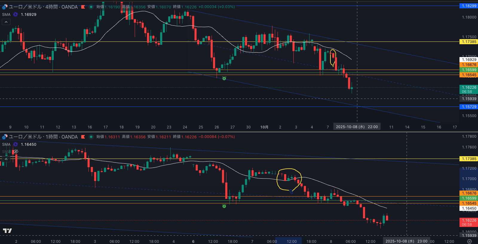 ・昨日の4時間戻り売りから日足の波に派生を考えると昨日考えた利確ポイントではまだ早い1時間ダウ転換まで少しでも持ち続ける