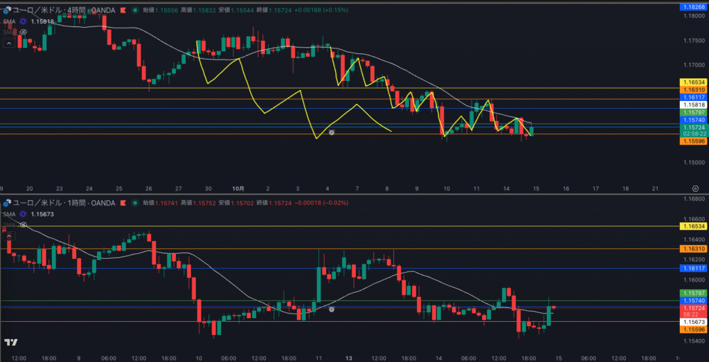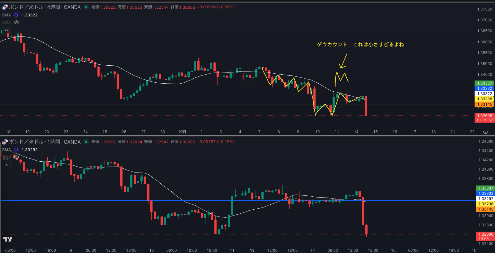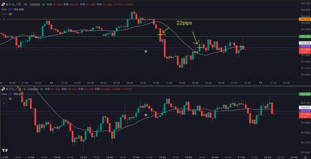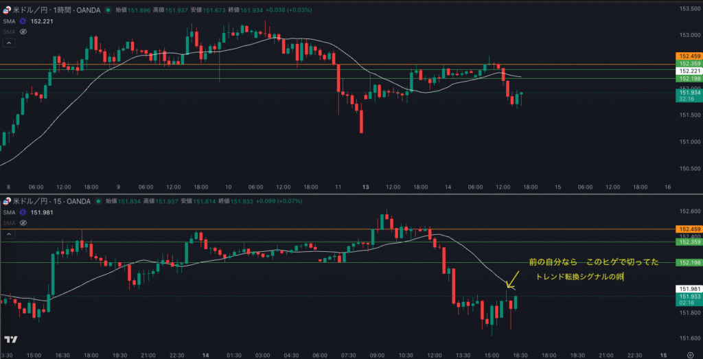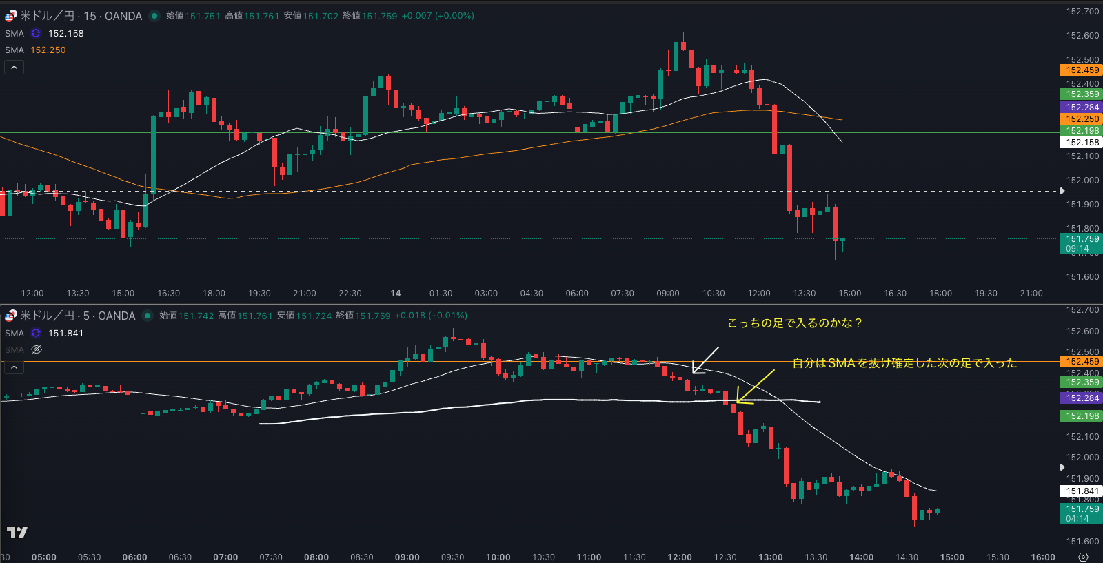 ・1時間が下になったタイミングで1時間SMAも抜けたところがエントリーポイント