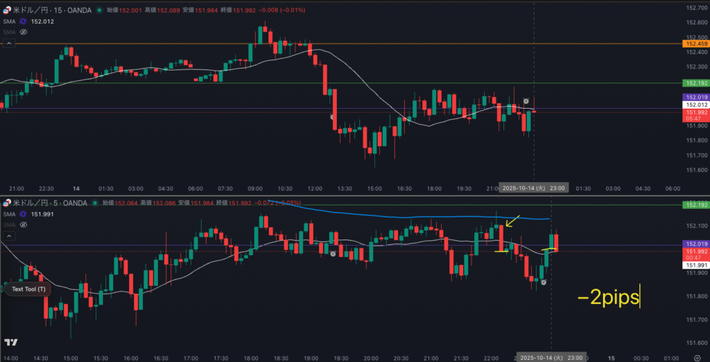 1時間SMAで5分ダウが崩れたところでエントリー - 結果波は出なかった・・