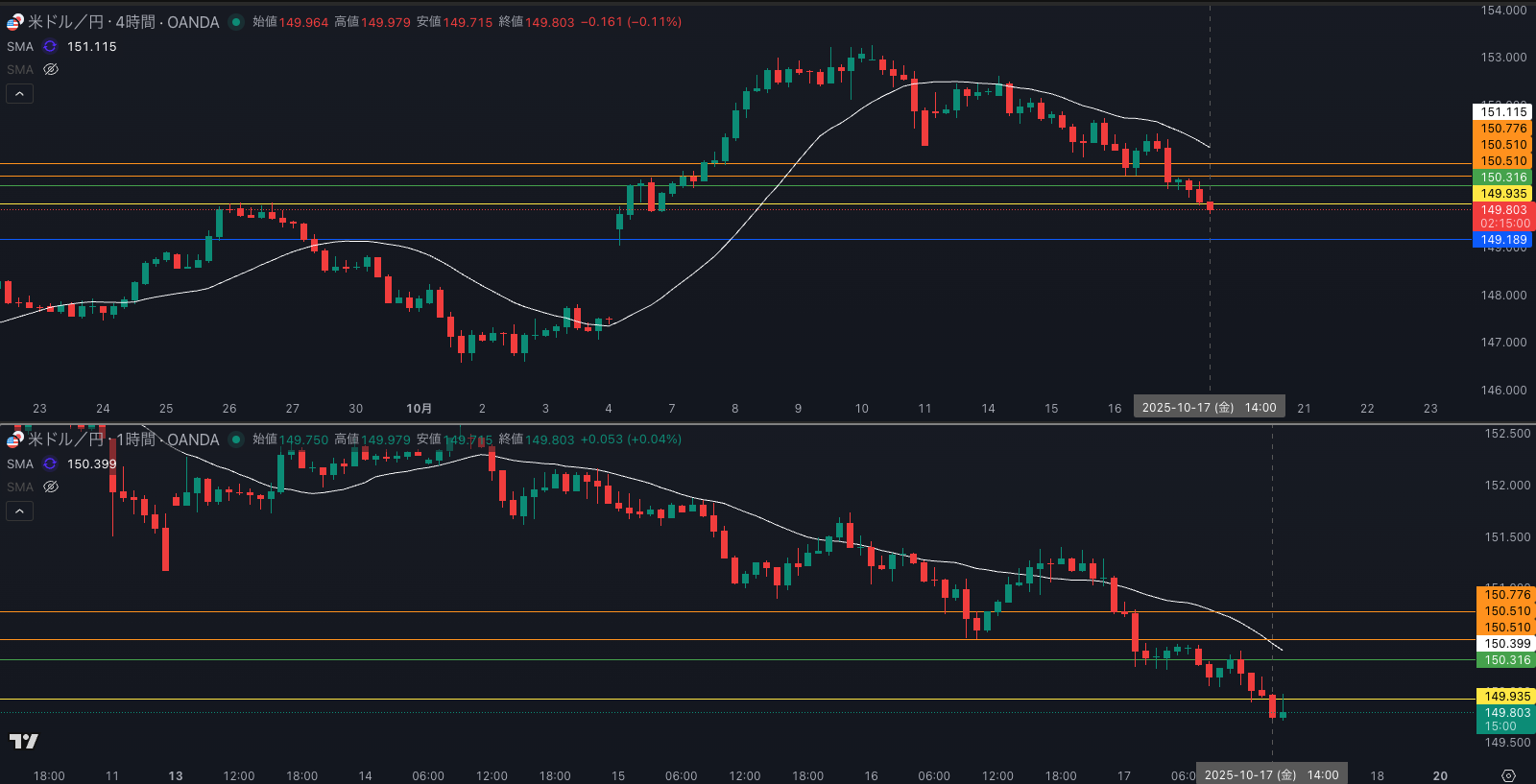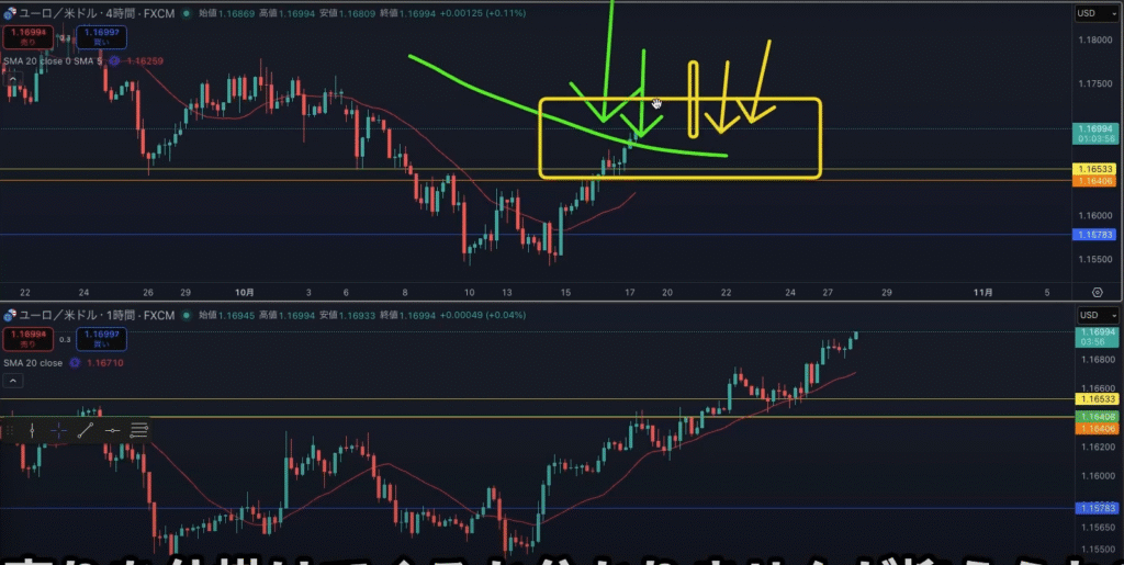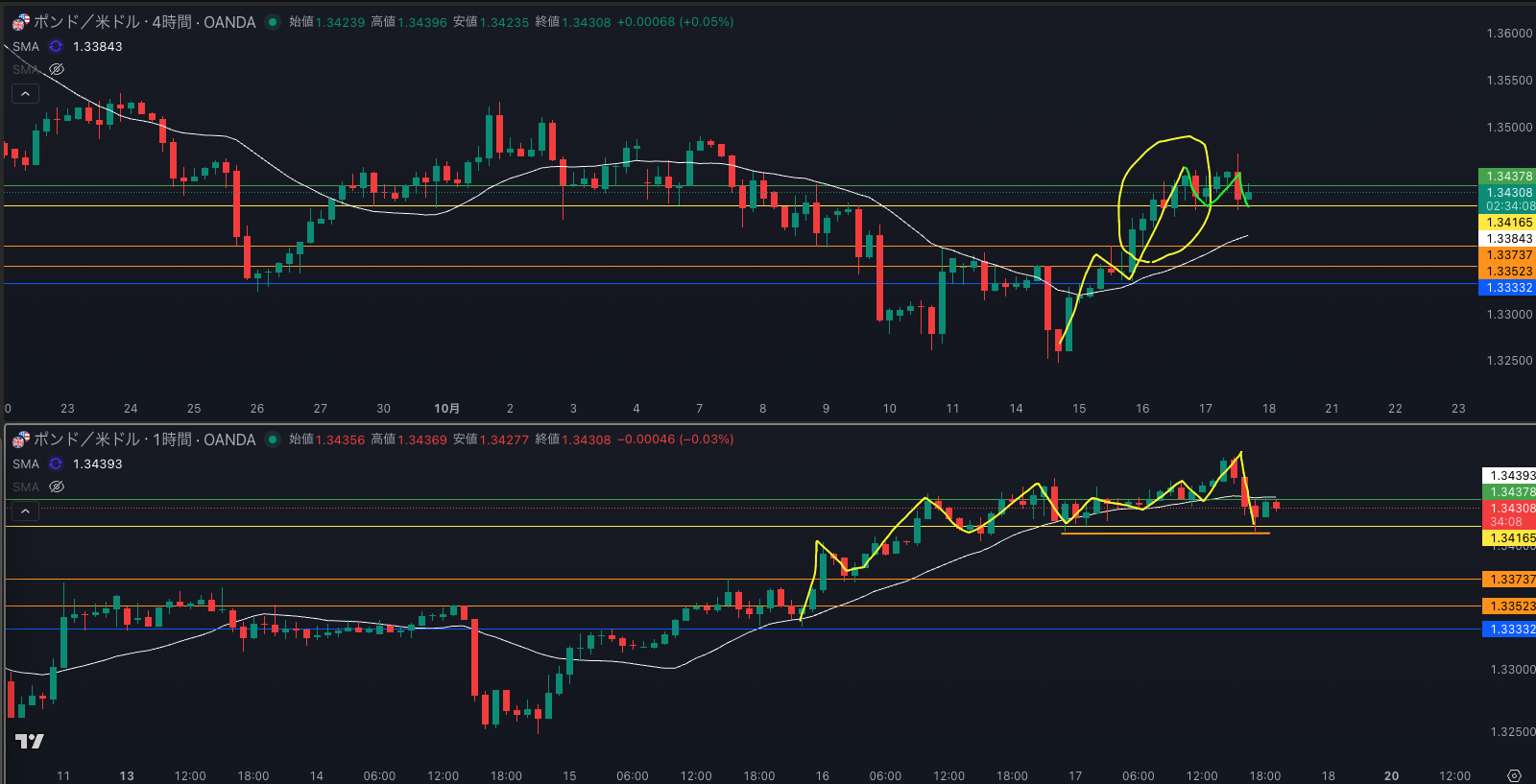 - 流れは日足も戻り売りの中の4時間押し目買いだが、日足のSMAがいる。
