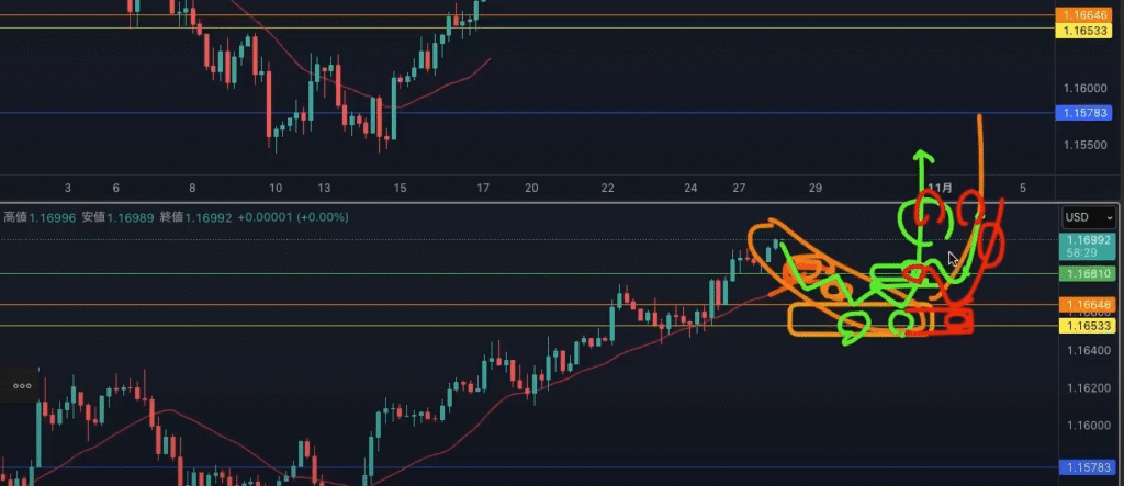 水平線・オレンジ色の水平線の下には押し目買い勢力