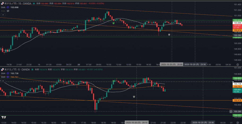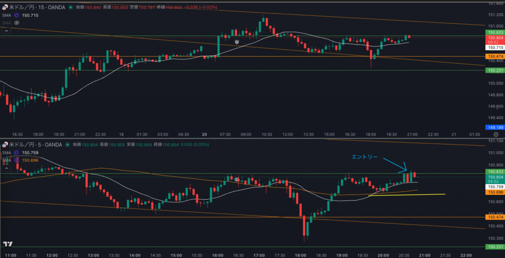 5分SMAを割って15分SMAで支えられたが戻りが弱いので一旦損切り−10pips
