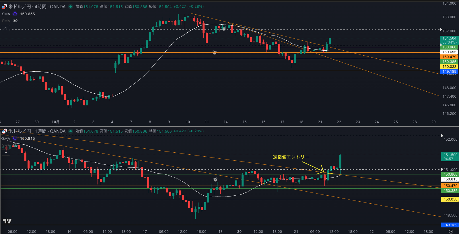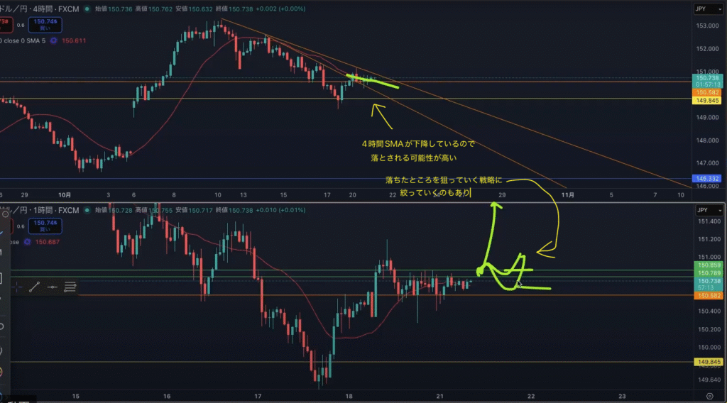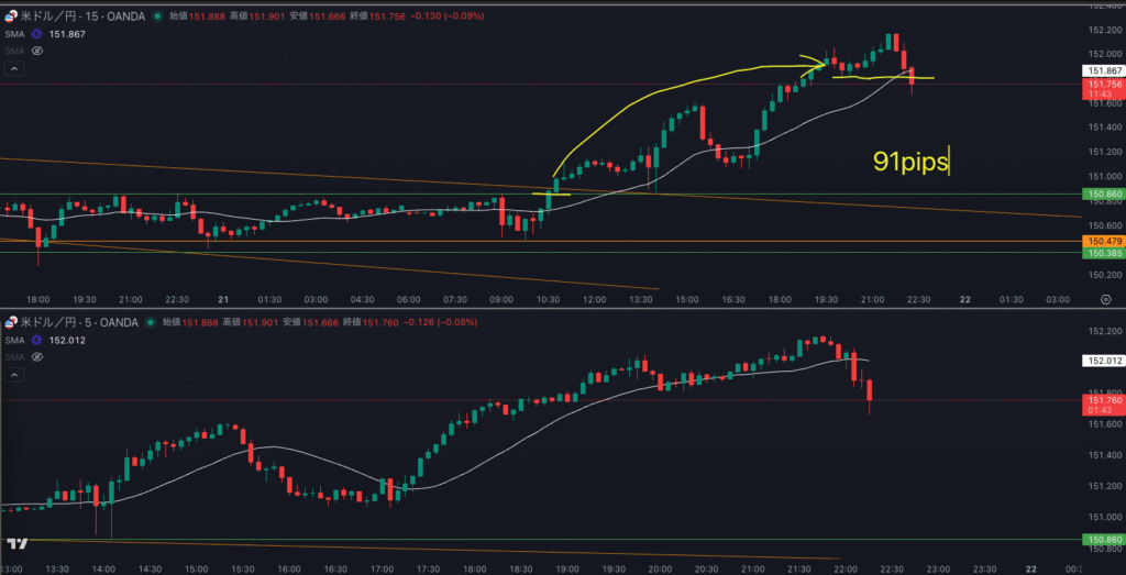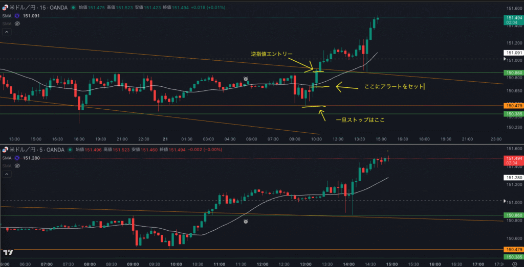 一旦、ストップは150.45 そこまでは嫌なので15分SMAの下にアラートをセットして放置