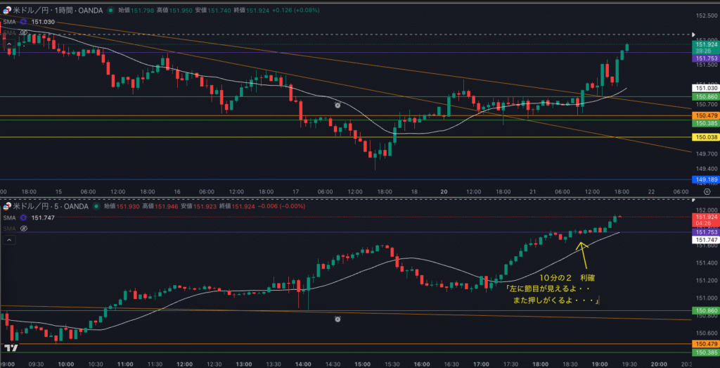 今朝の状態からだと斜め攻防ライン抜けと見えるが1時間下降の波の途中なので観察していく