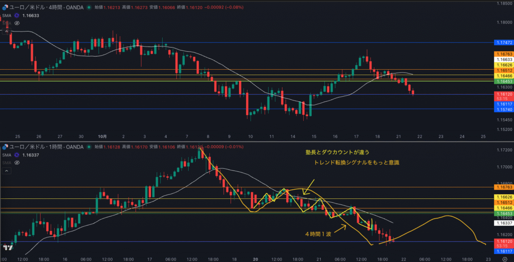 4時間SMAの上にのっかてくると戻し過ぎなのでレンジもしくはトレンド転換シグナルの卵状態の時のダウカウントが違うかを検討していく