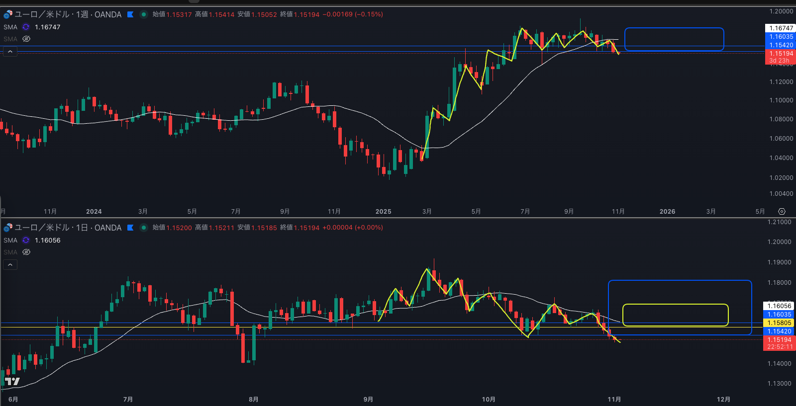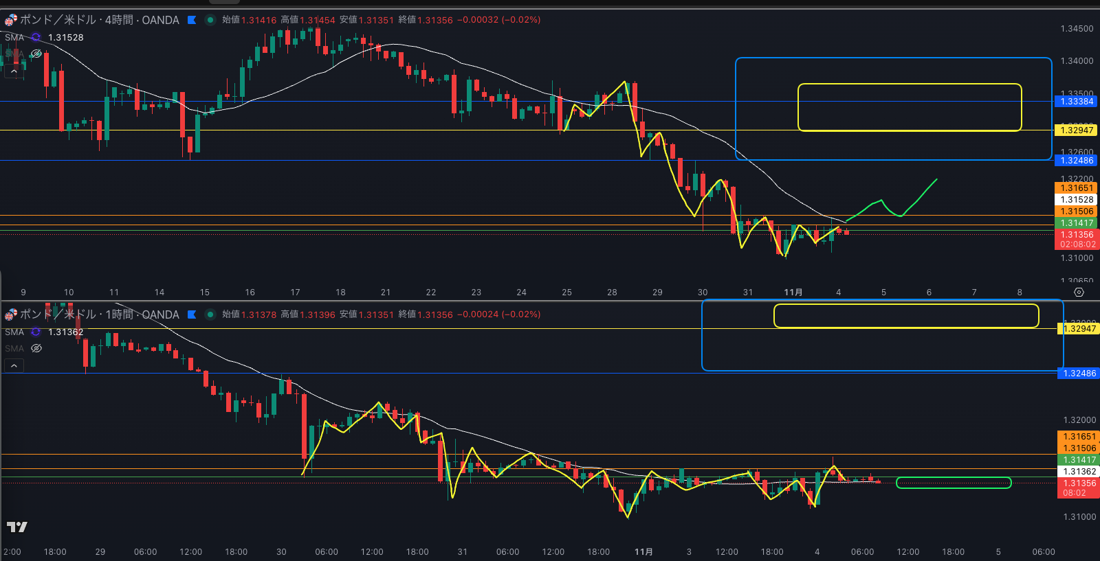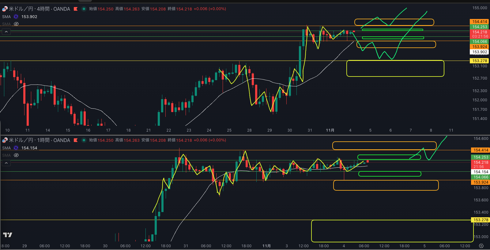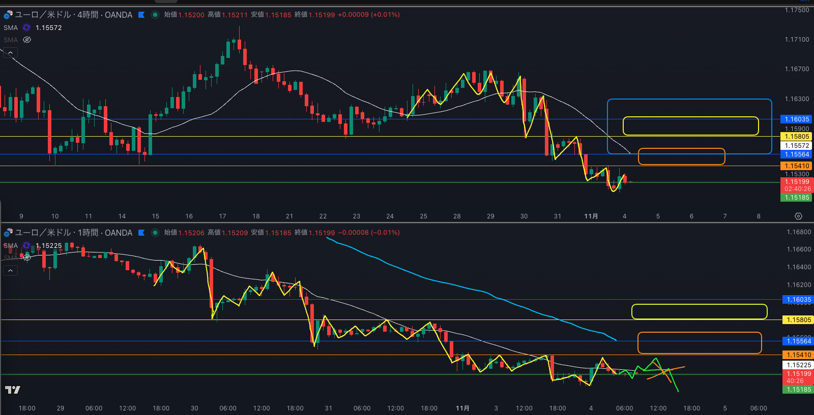 - 4時間下抜けすると日足の押しをつけに行くか、4時間SMAが上昇の角度が急なので下がっても戻されやすい この場合 週後半まで観察