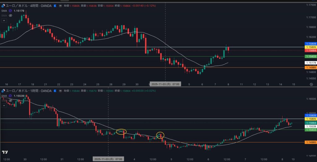 まず15分 - 手仕舞いしたポイントは15分のSMAでちょうど抑えられているところ