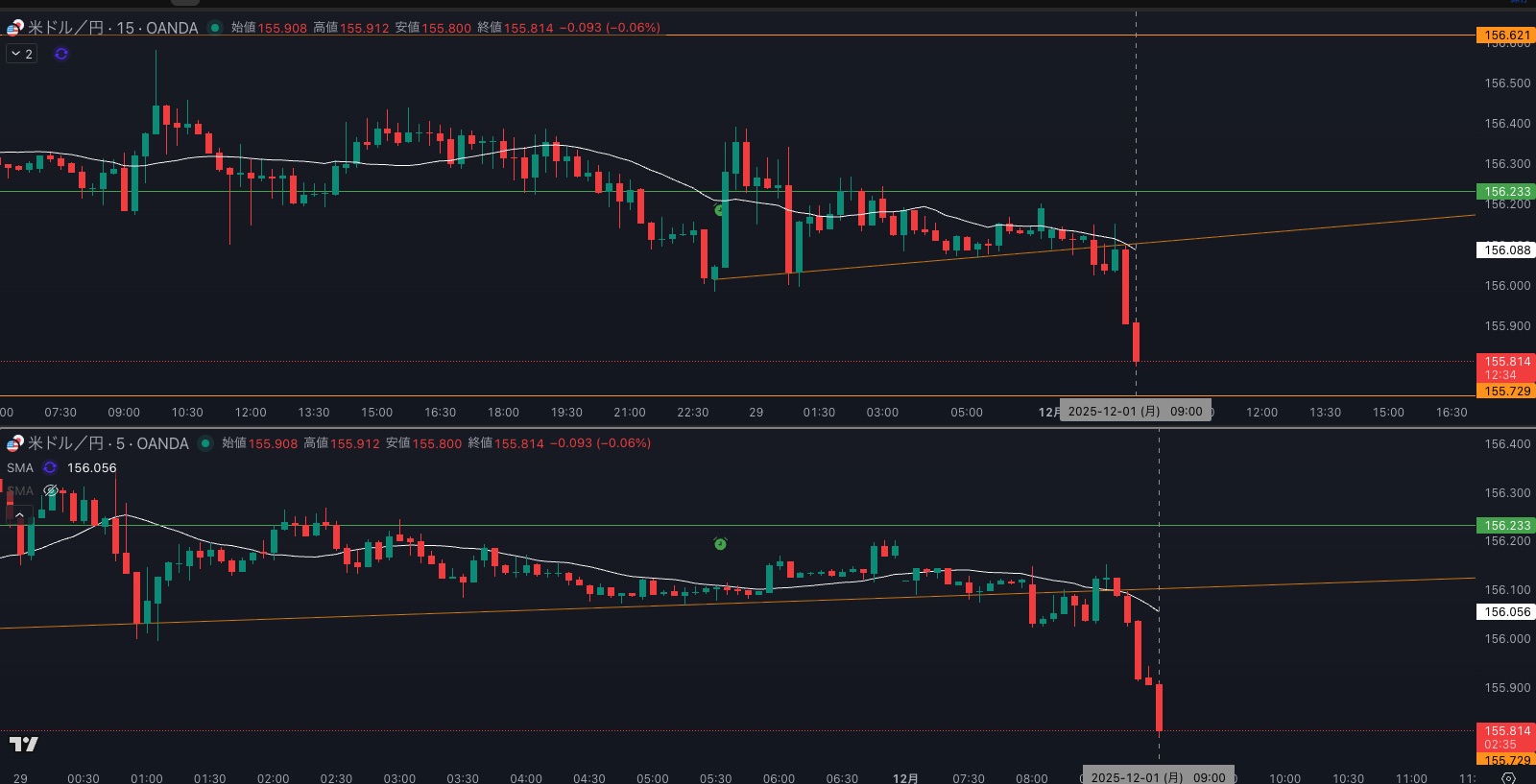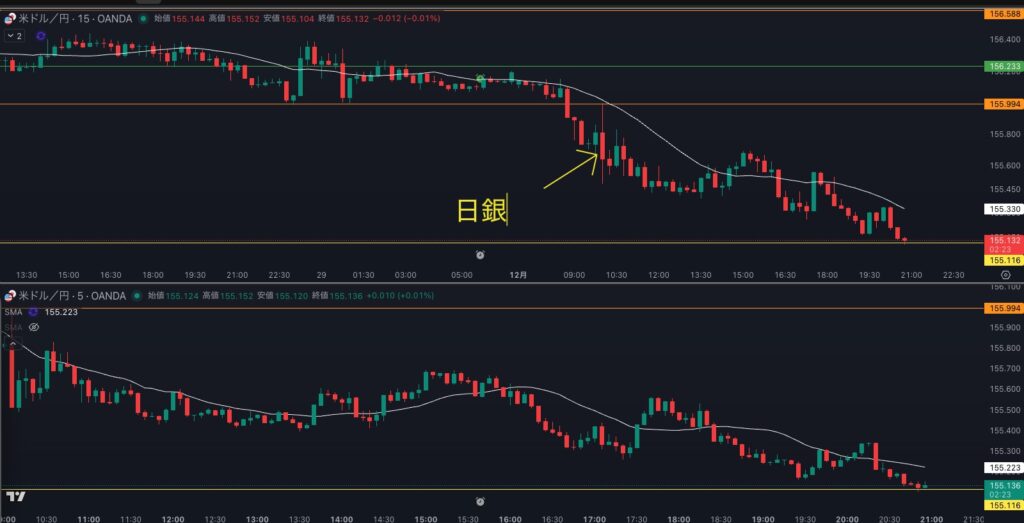 エントリーポイントは 斜め下抜け、5分SMAも下抜けした足 8時40分の足か・・