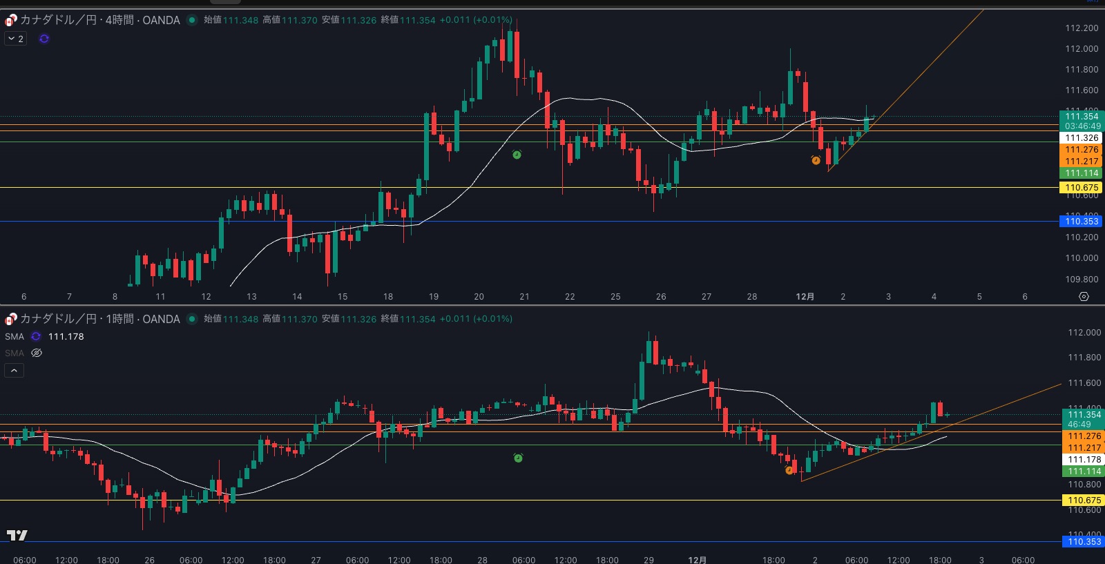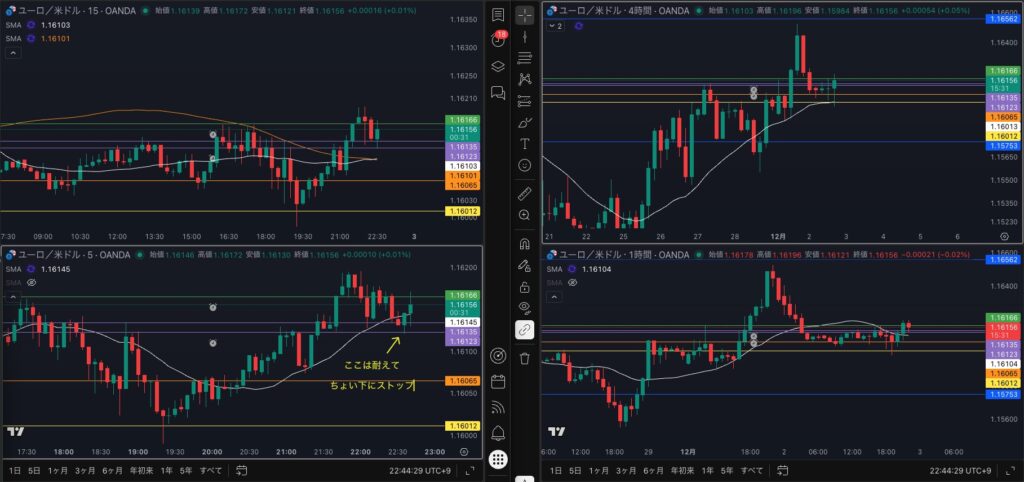 ・朝の環境認識では上の4時間の水平線まで戻すと戻しすぎ??と判断していた