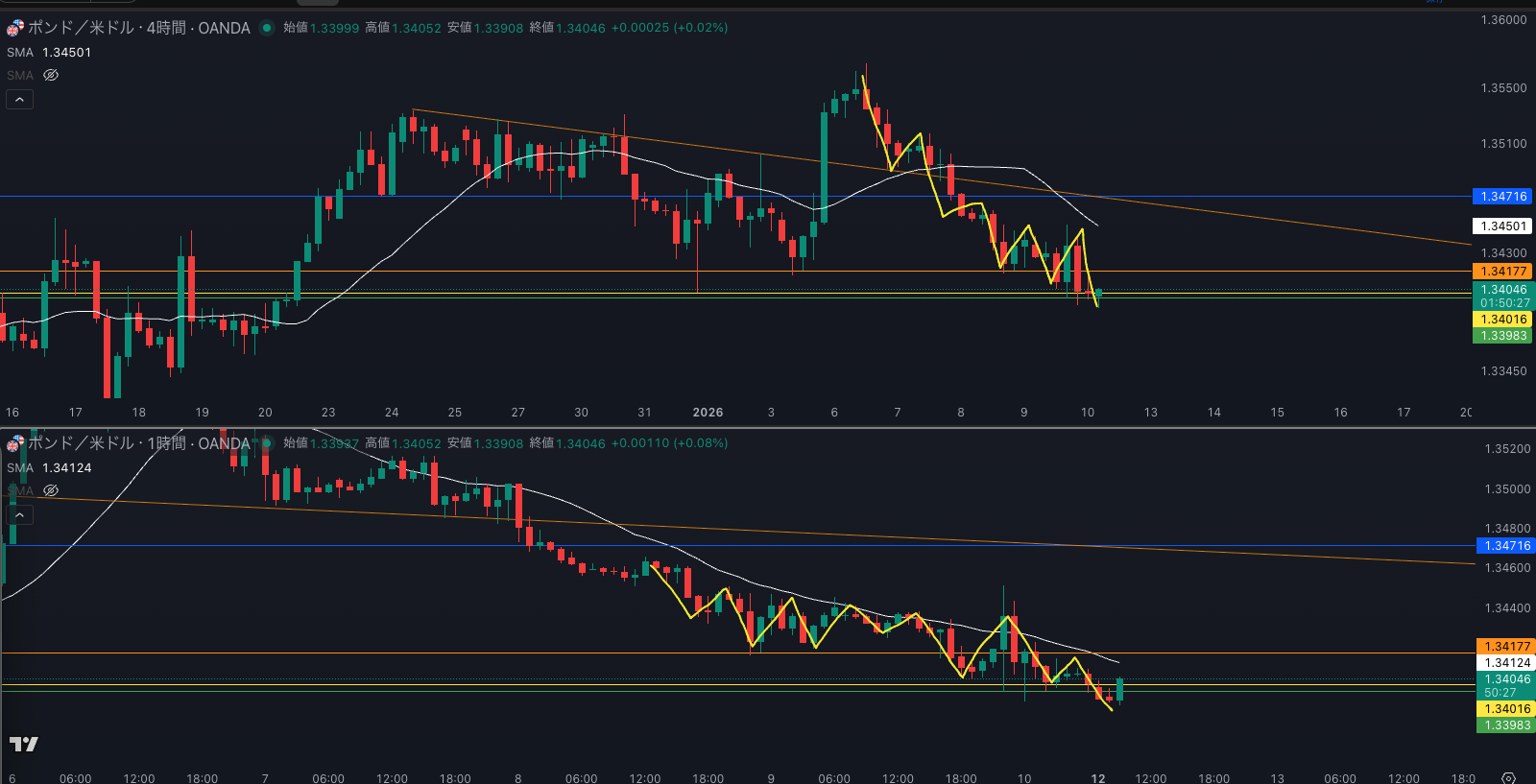 (日足下降の波の途中だから)だが、4時間 SMAに引き付けて狙っていく