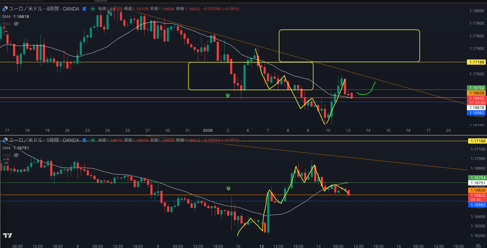 SMAの位置から上のラインを考えていくが臨機応変に - 4時間では押し目買い