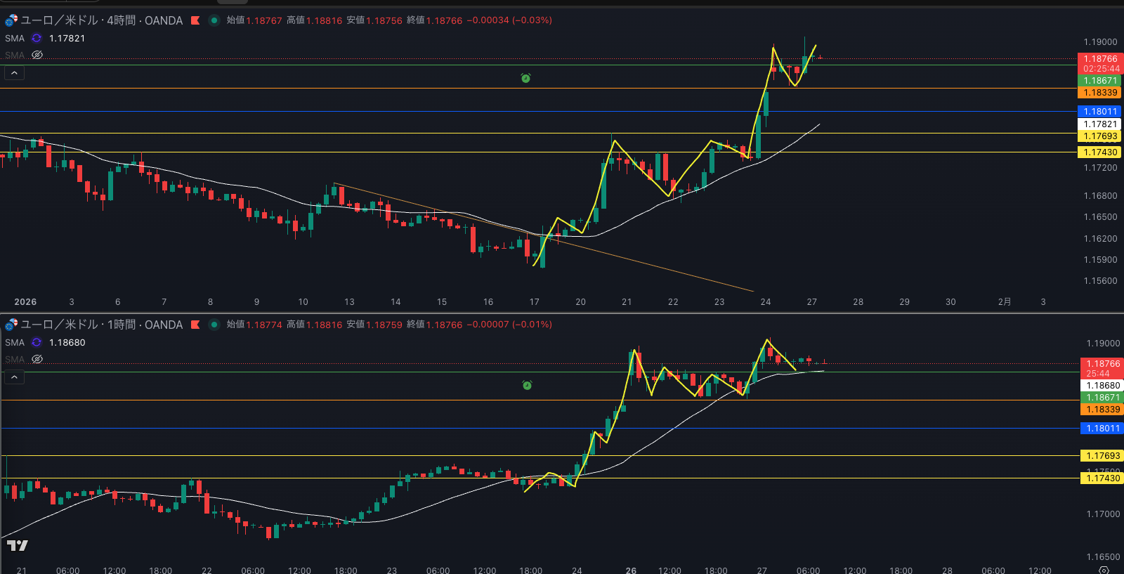 SMA・1時間SMAは上昇 買い支え