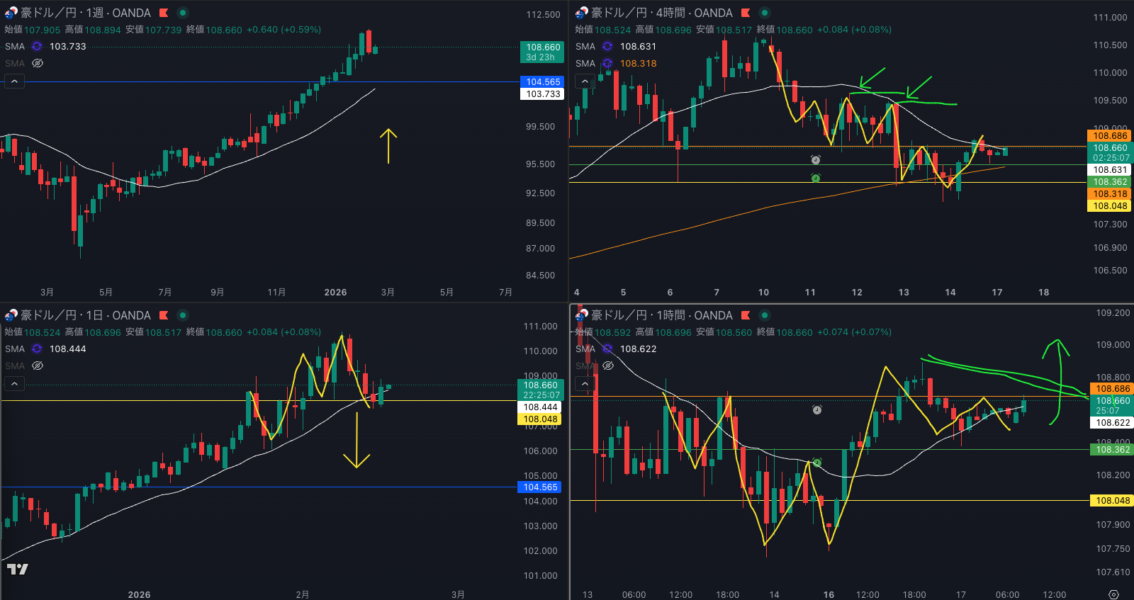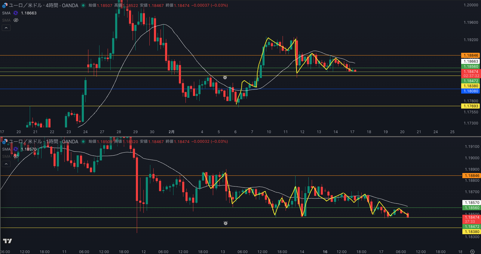 SMA・4時間SMAは 下降 売り抑え