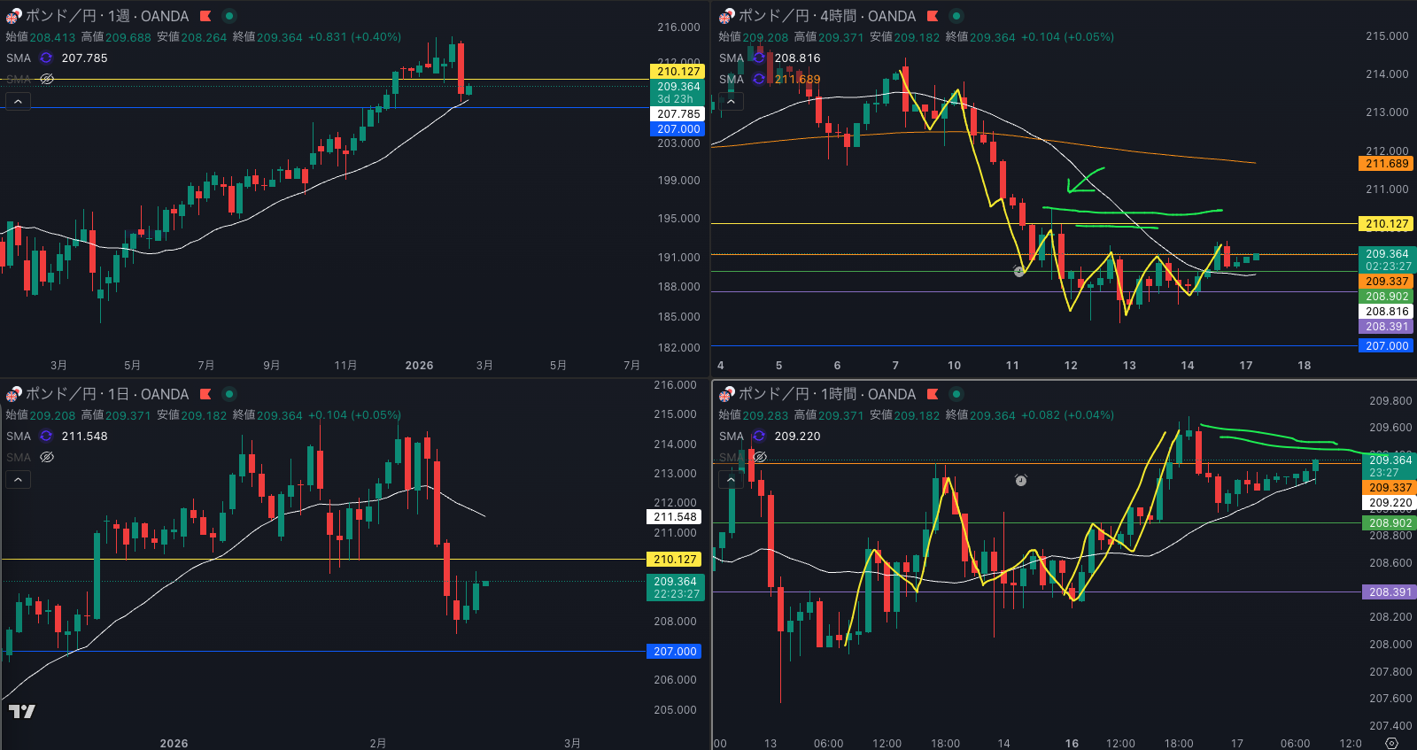 ポンド円は 4時間1波が出た後 4時間 SMAに乗せてきている 狙うのはこれか