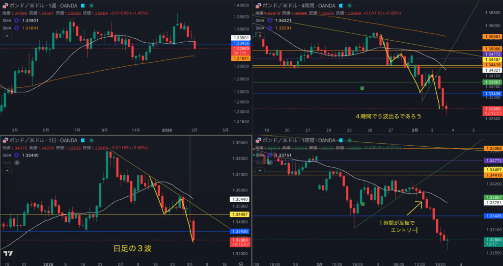 - 日足下降の波の途中では4時間で狙って行くだが、4時間は時間経過が必要