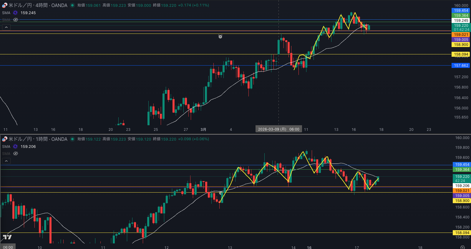 4時間全戻しの売りが 159.3〜4で出てくると思うと