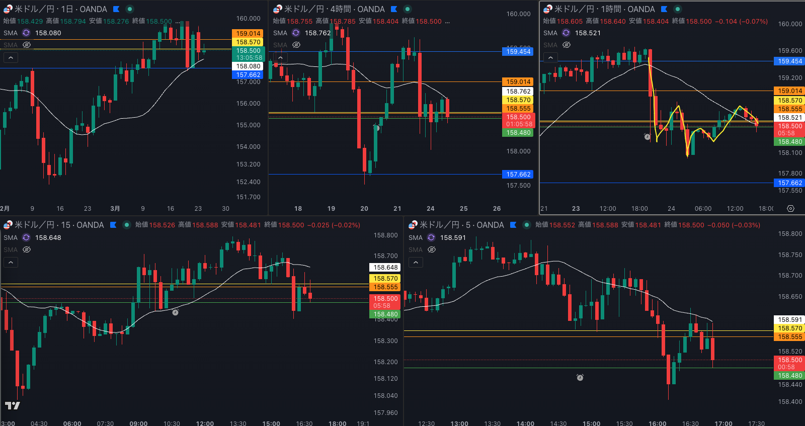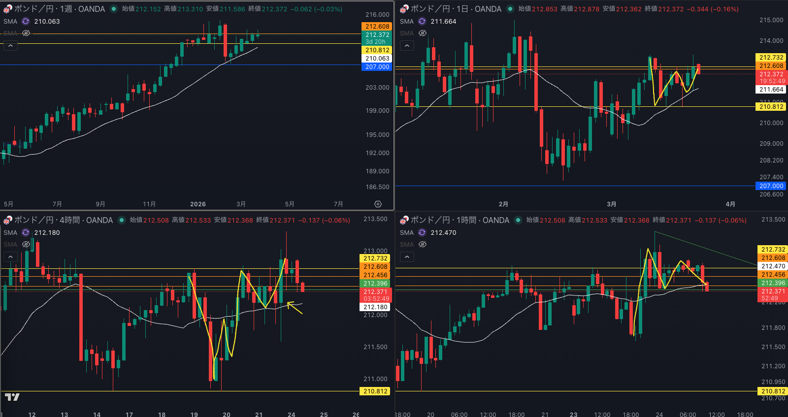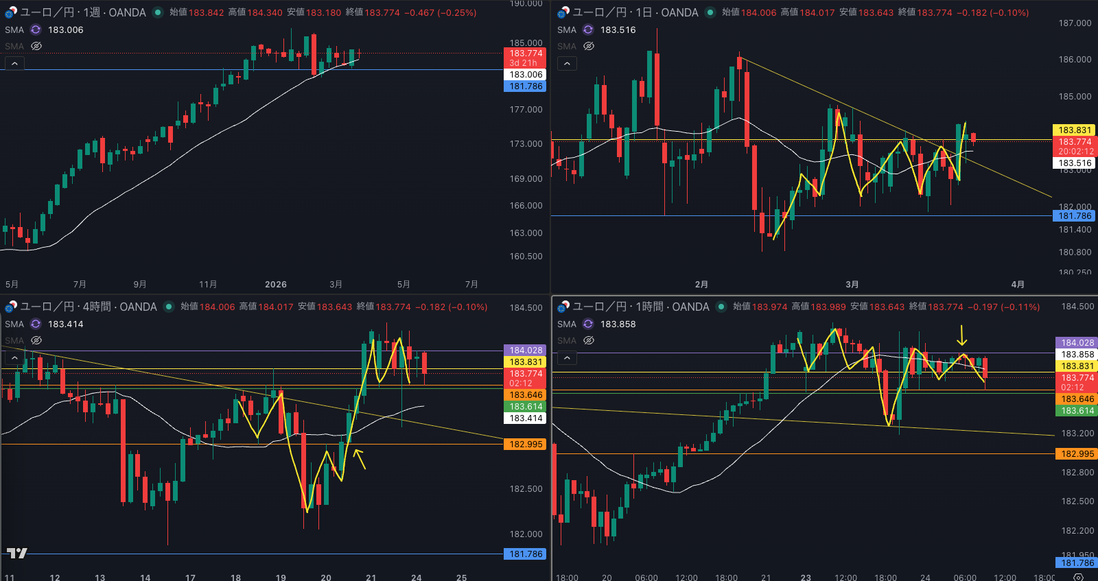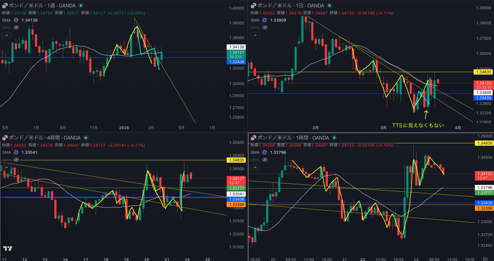 週足の目線が変わった辺りと日足 SMAが意識されているか - 4時間戻り売り