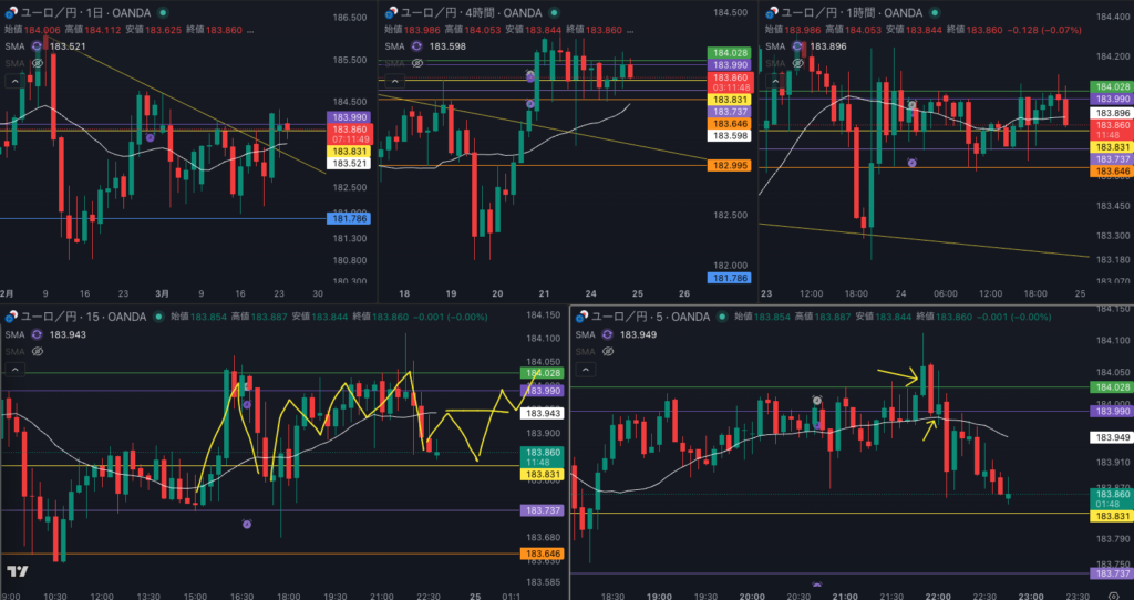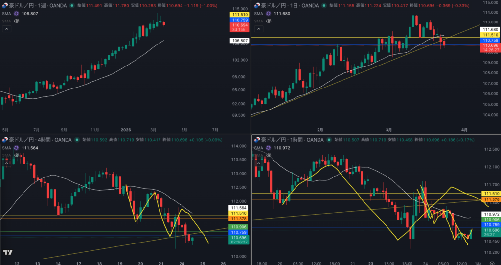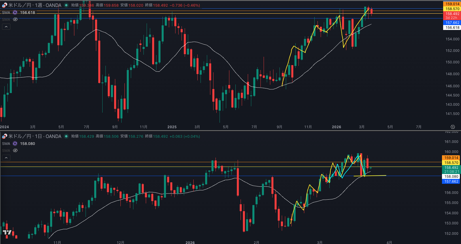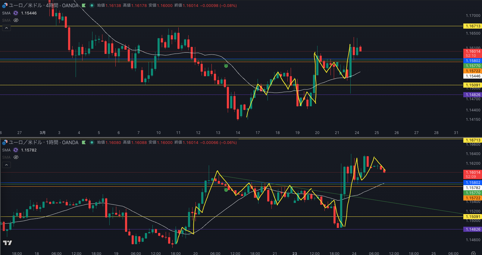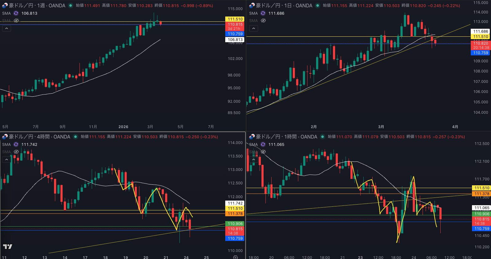 週足の目線が変わった辺りと日足 SMAが意識されているか - 4時間戻り売り