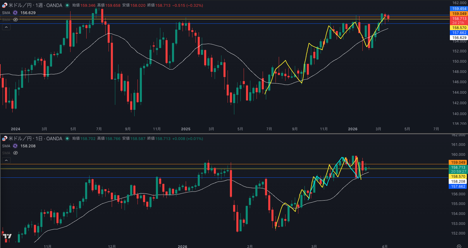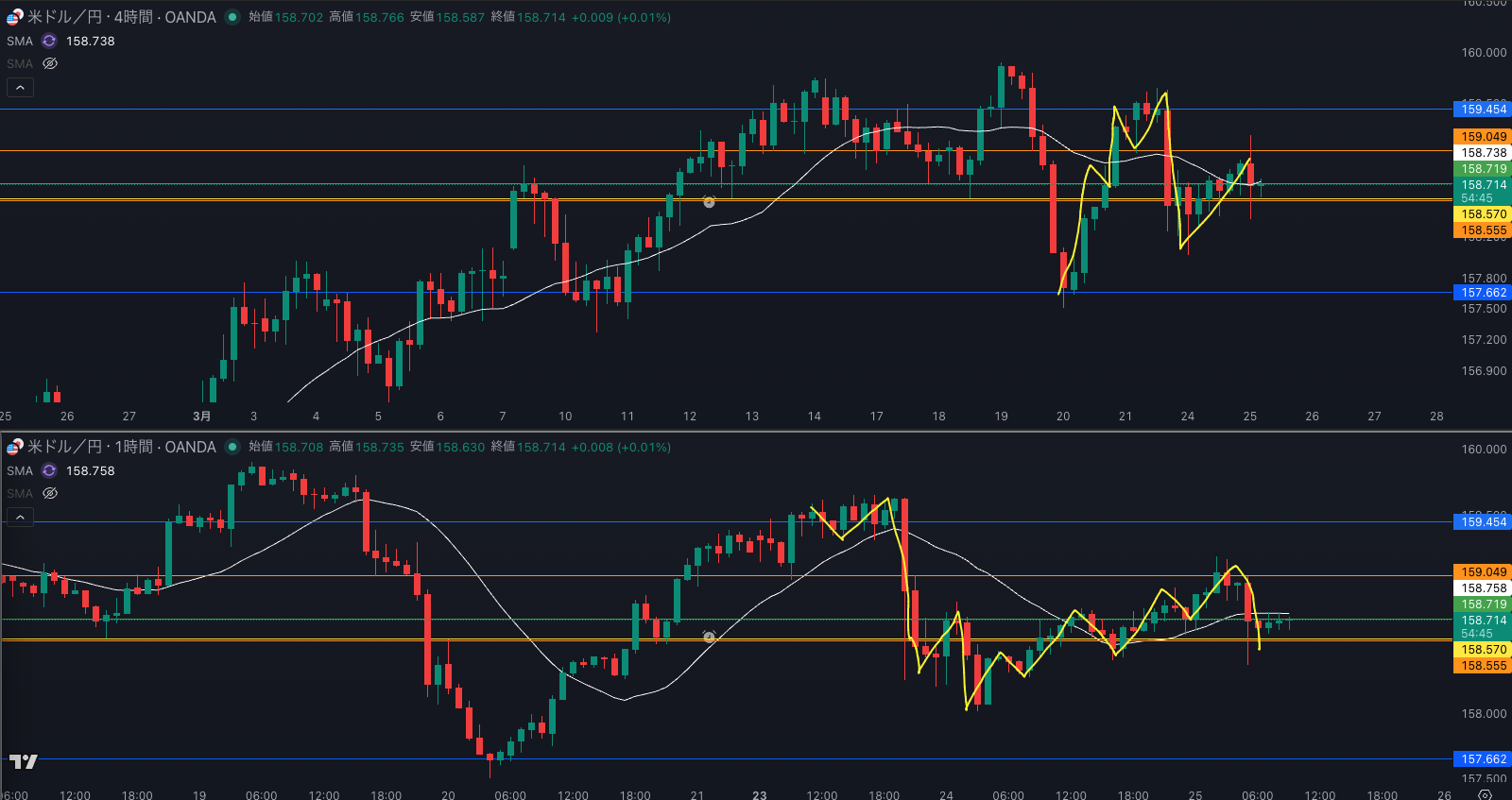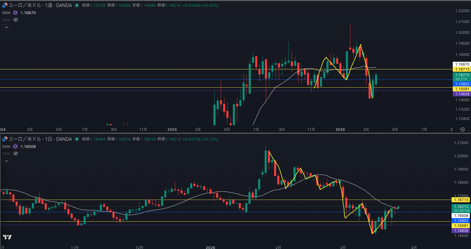 週足の目線が変わった辺りと日足 SMAが意識されているか - 4時間ダウカウントがわかりづらい