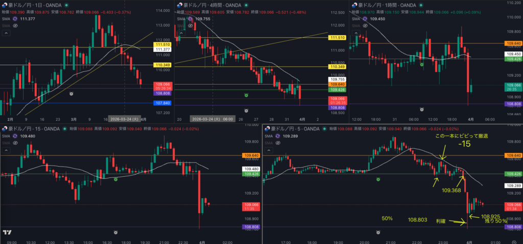 - 5波なので 半ロット 15分ダウ崩れで一旦手仕舞い