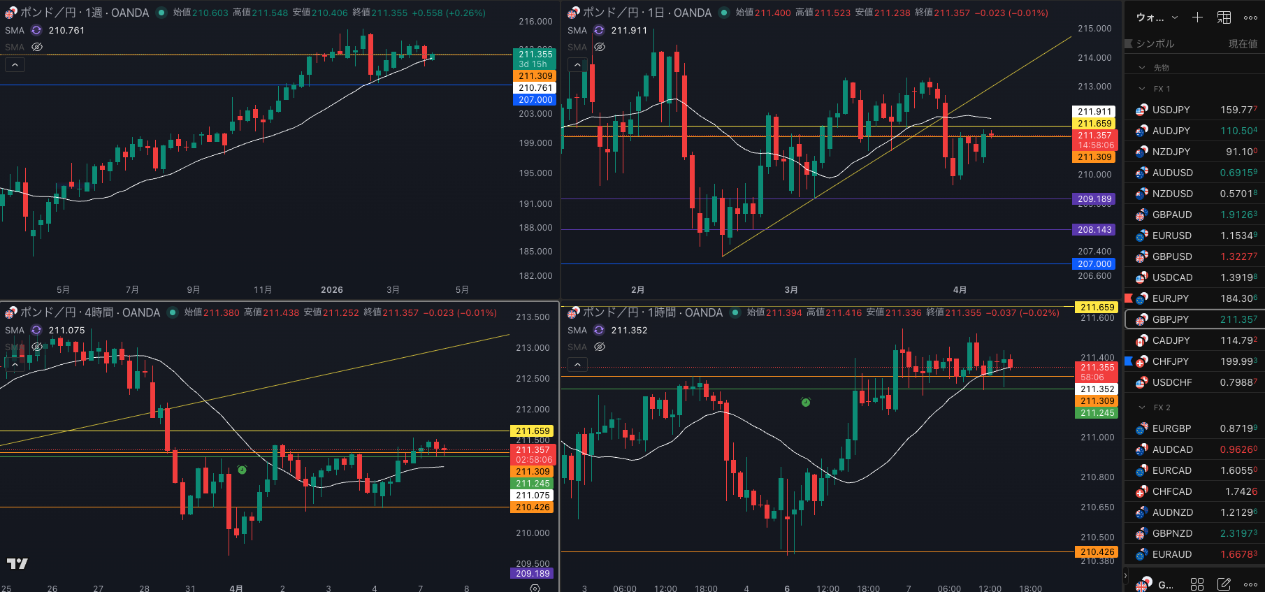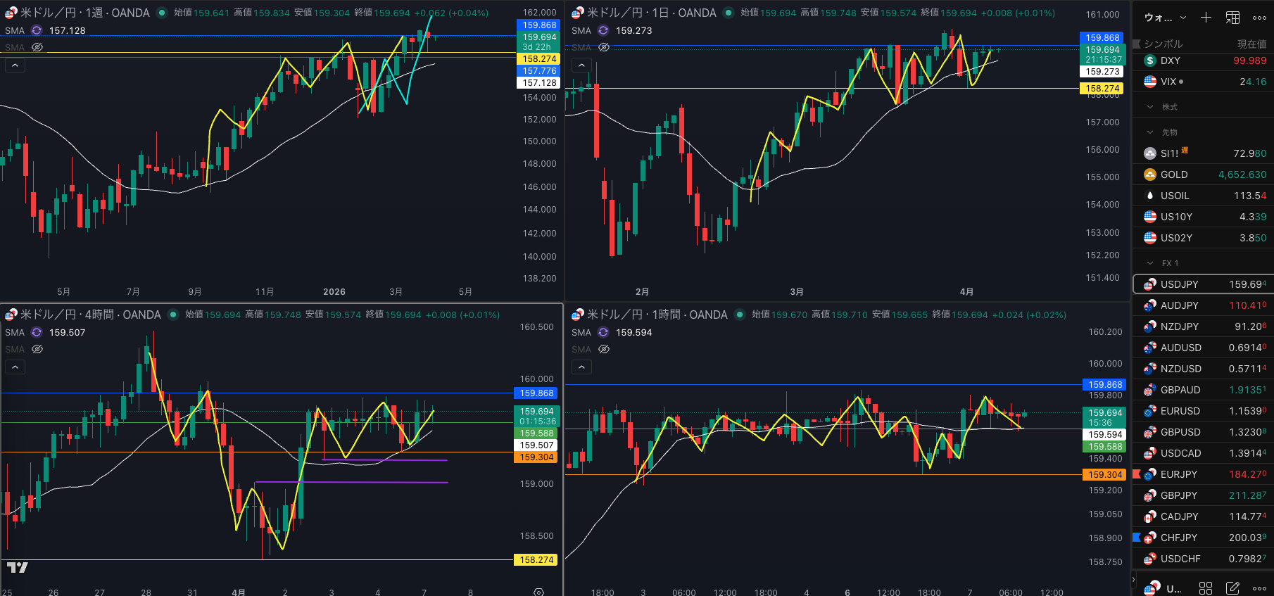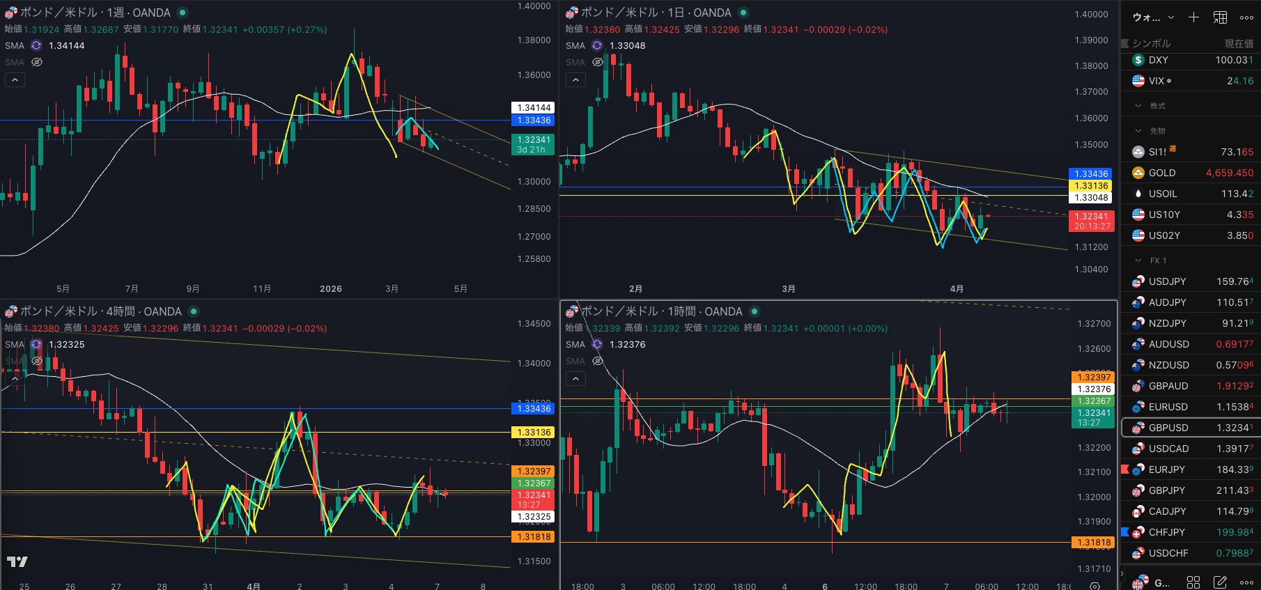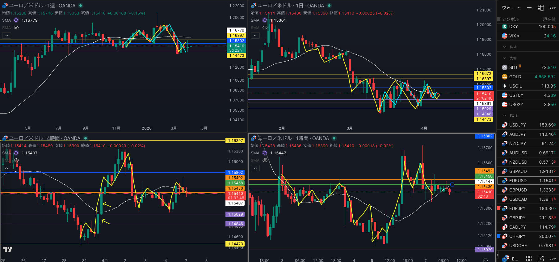 日足のレジスタンスで1時間戻り売りで4時間 SMAを試すか・・・