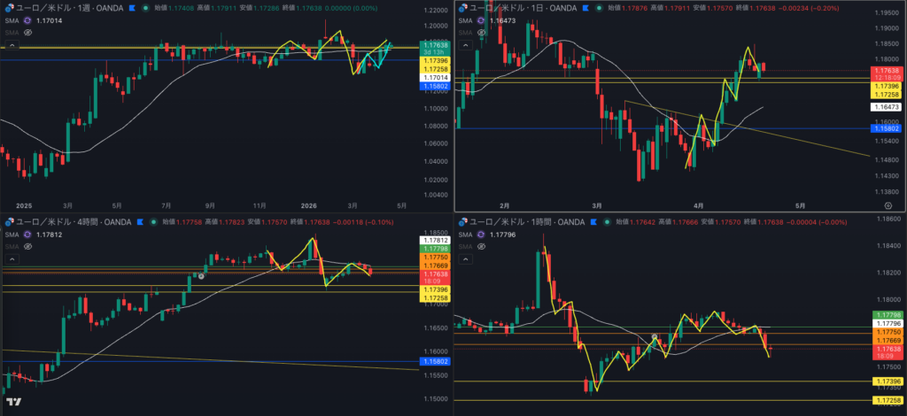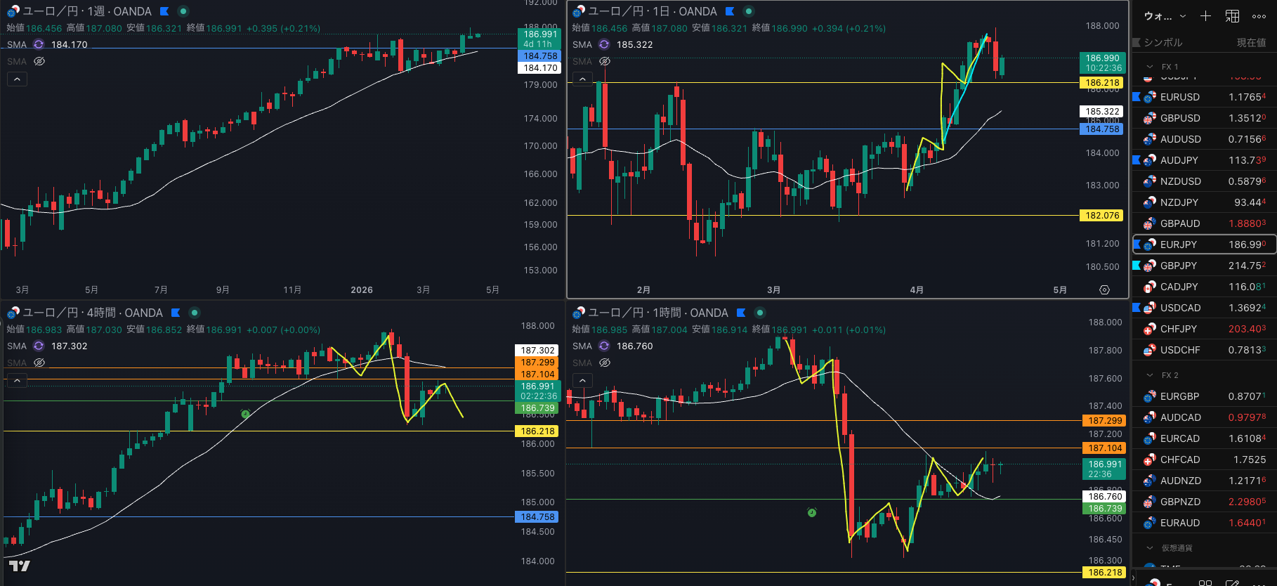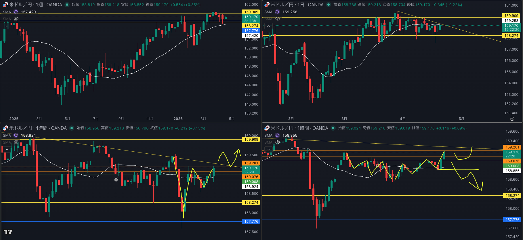 - 1時間の戻り売りで4時間smaとサポートを試す?日足上だけど